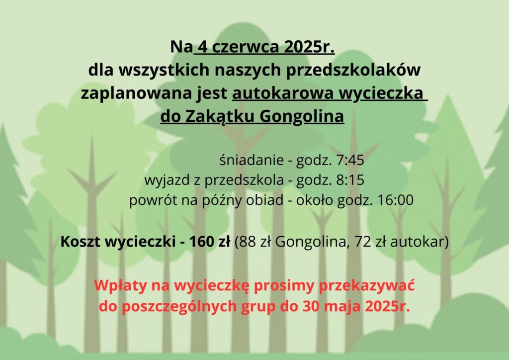 Wycieczka “Zakątek Gongolina” Data 11 maja 2025 Udostępnij: admin Poprzedni post ROAR DANCE - maj 11 maja 2025 Następny wpis Szkolny serwis rowerowy 16 maja 2025 Może Ci się spodobać Zebranie Rady Rodziców 3 lutego, 2026 Zapraszamy do naszego PRZEDSZKOLA 28 stycznia, 2026 Śpiewaj i tańcz jak Elvis Presley – fotorelacja 19 stycznia, 2026