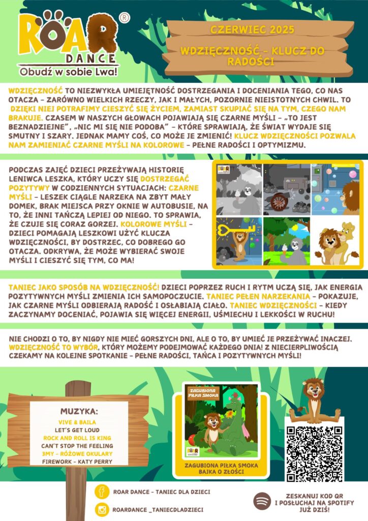 w czerwcu, w ramach zajęć Roar Dance, pracujemy z dziećmi nad tematem wdzięczności – wartości, która buduje pozytywne relacje, wzmacnia poczucie szczęścia i pomaga dzieciom lepiej radzić sobie z wyzwaniami.
